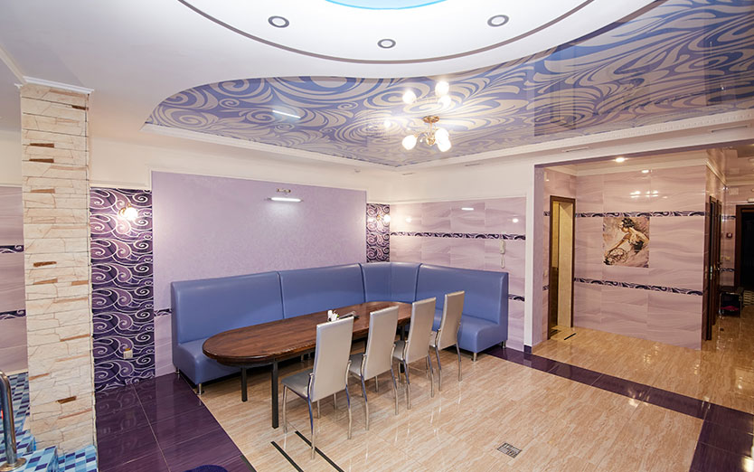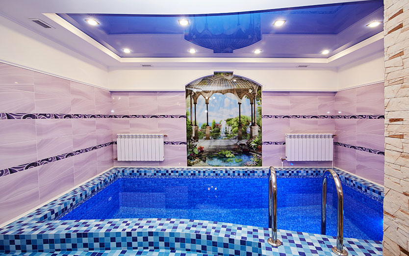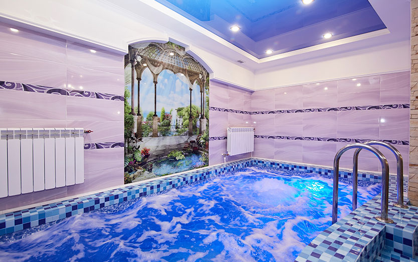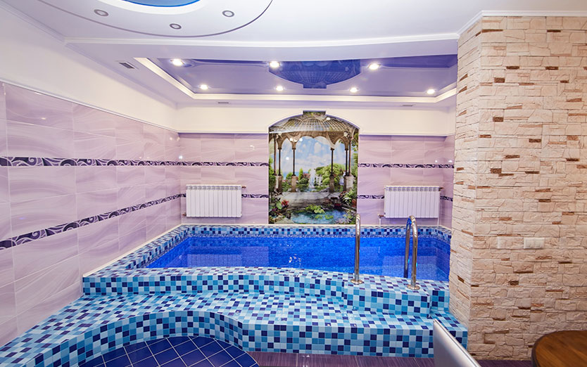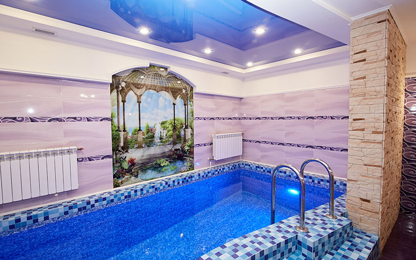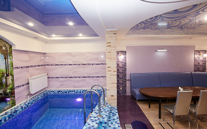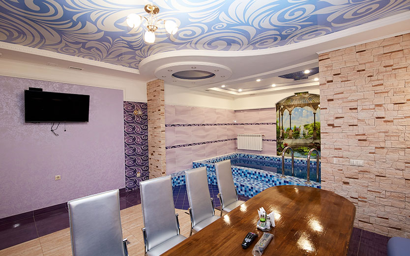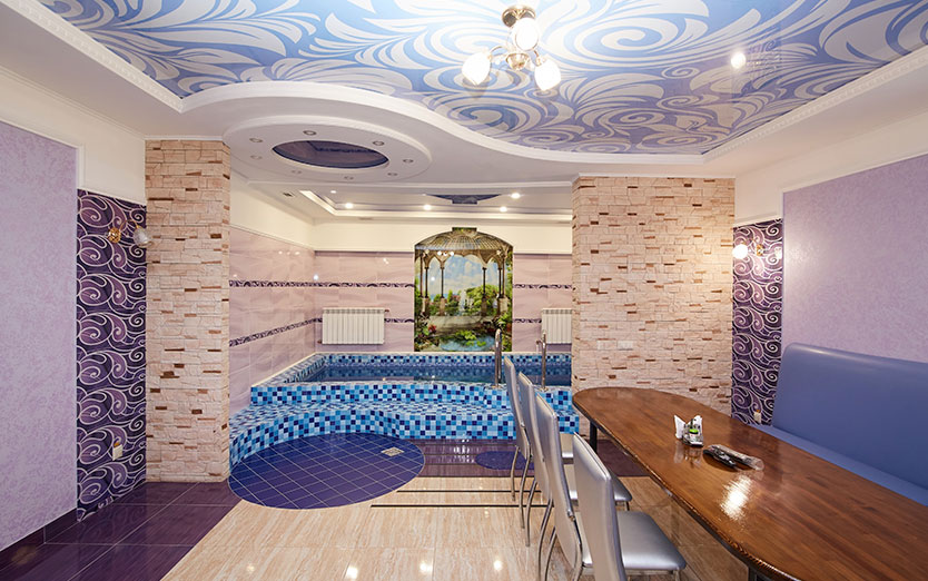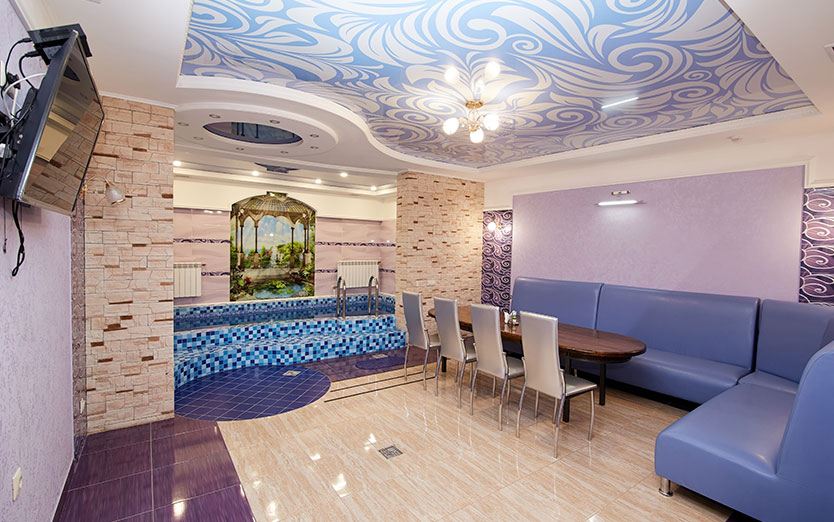 Банкетный зал, парная, душ, комната отдыха, бассейн, гидро массаж, подцветка бассейна, сан узел, TV, WiFI, муз центр, фен, эл чайник, шапки для парной, микровол. печь, посуда, ваза.