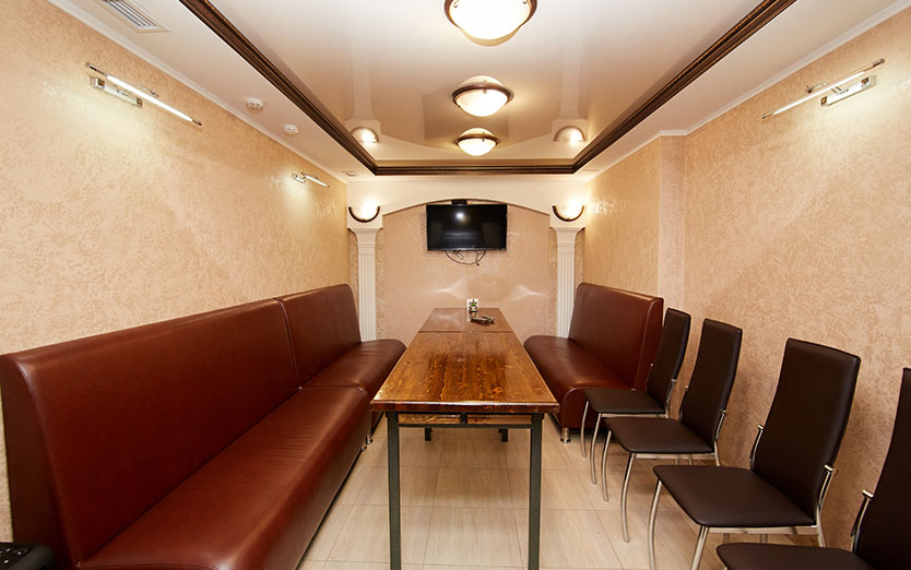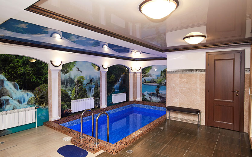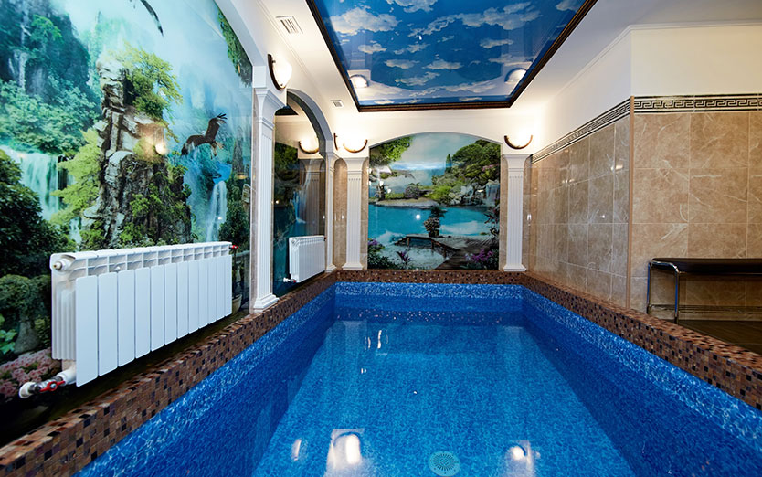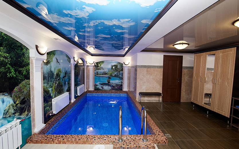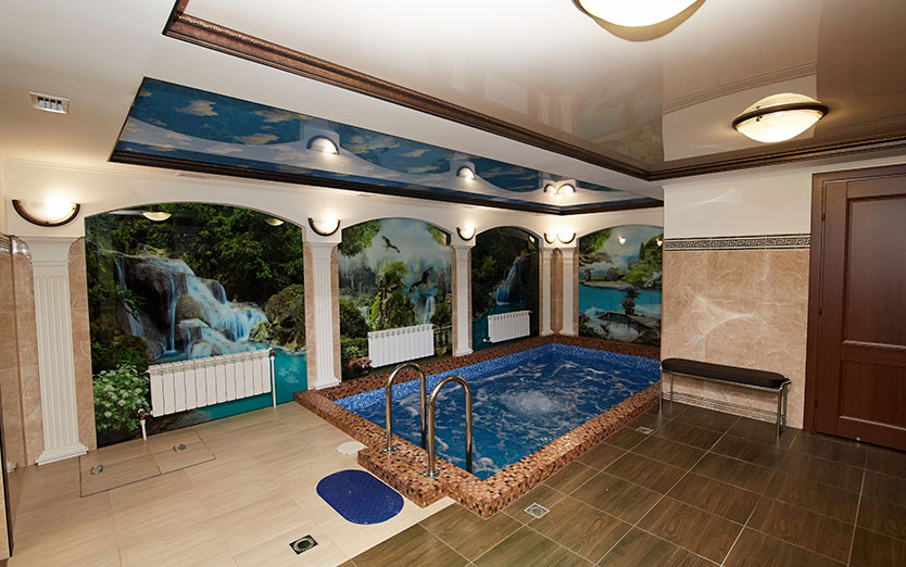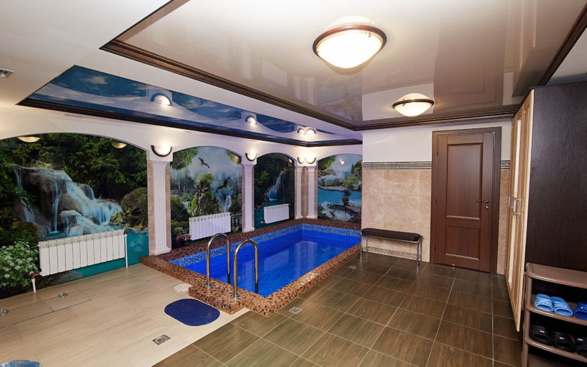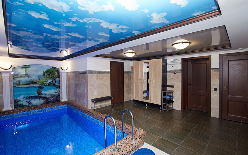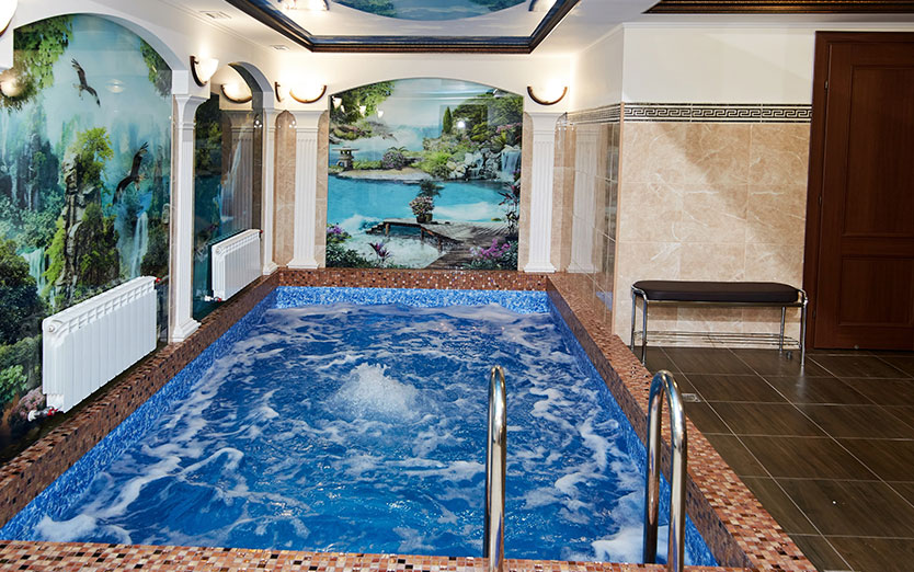 Банкетный зал, парная, душ, комната отдыха, бассейн, гидро массаж, подцветка бассейна, сан узел, TV, WiFI, фен, электро чайник, шапки для парной, микроволновая печь, посуда, муз – центр, ваза.